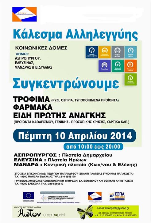 ΕΚΔΗΛΩΣΗ/ΣΥΓΚΕΝΤΡΩΣΗ ΠΡΟΪΟΝΤΩΝ ΣΤΑ ΠΛΑΙΣΙΑ ΥΛΟΠΟΙΗΣΗΣ ΤΟΥ ΠΡΟΓΡΑΜΜΑΤΟΣ «ΚΟΙΝΩΝΙΚΕΣ ΔΟΜΕΣ ΣΤΟΥΣ ΔΗΜΟΥΣ ΑΣΠΡΟΠΥΡΓΟΥ, ΕΛΕΥΣΙΝΑΣ ΚΑΙ ΜΑΝΔΡΑΣ-ΕΙΔΥΛΛΙΑΣ»